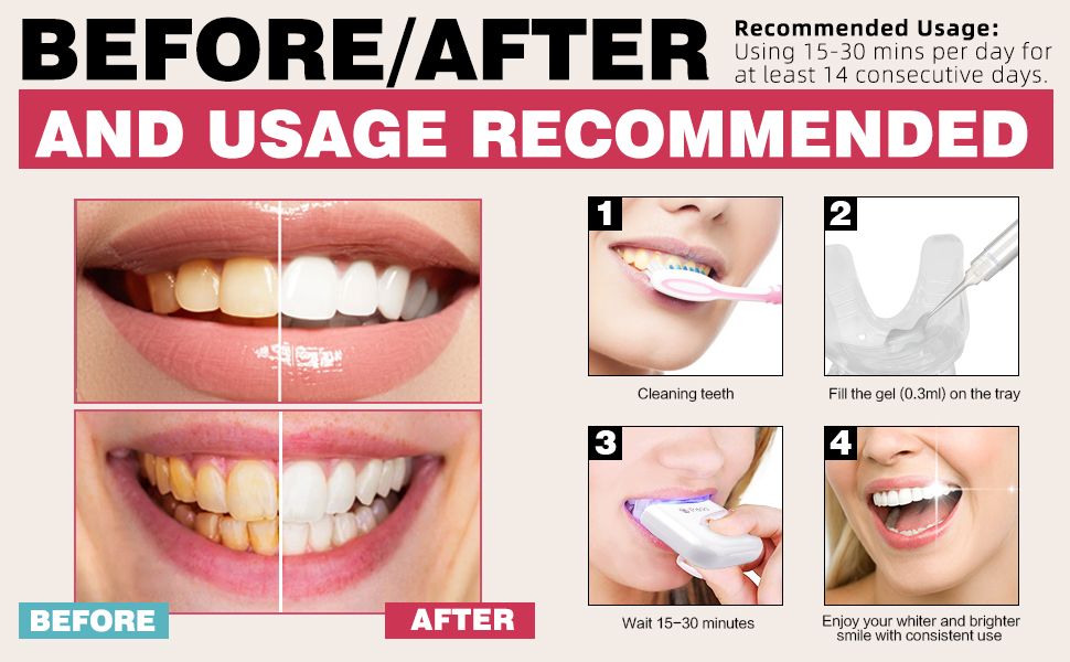 • 【PORTABLE EASY TO USE TEETH WHITENING KIT】with our soft mouth tray that fits any mouth (men and women), no molding or boiling required – Gel Syringes Whitens the top and bottom at the same time – Eco-friendly: no battery needed (compatible with iPhone, Android, USB type-C, USB).